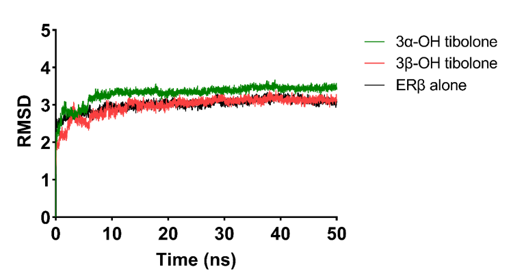 Molecular dynamics studies showing the root-mean square deviation of tibolone metabolites in complex with estrogen receptor beta.