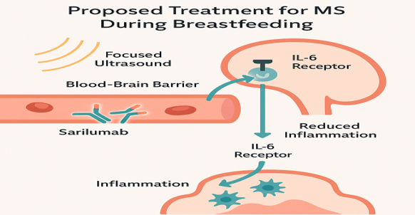 Figure 3 This diagram illustrates our proposed non-hormonal treatment for MS during breastfeeding. Focused ultrasound gently opens the blood–brain barrier, allowing our Sarilumab antibodies to enter the brain and block IL-6 receptors. By preventing IL-6–driven inflammation, this approach mimics the natural immune protection seen during breastfeeding, helping reduce MS relapses safely and effectively.