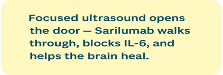 Figure 2 This simple phrase captures the essence of our idea — using focused ultrasound to open the brain’s barriers so Sarilumab can step in, block inflammation, and help the brain repair itself.