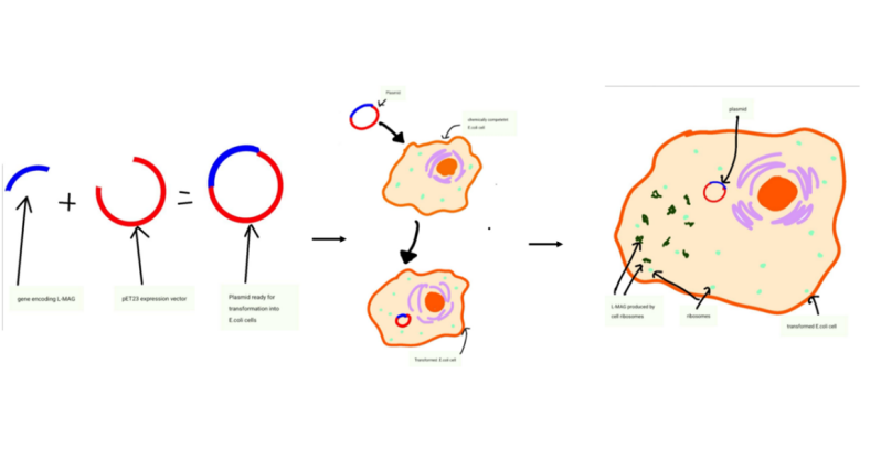 A chemical transformation could be carried out to insert the L-MAG gene into the chosen E. coli cells. The protein gene would then be expressed within these cells, resulting in the L-MAG protein being produced by the cell ribosomes. The protein could then be extracted from the E. coli cells and purified using methods such as Ion Metal Affinity Chromatography (IMAC), Structural Genomics Consortium, 2008 (7). To produce L-MAG we suggest the use of the Bl21 (DE3) pLysS E. coli strain due to its high suitability for recombinant protein production, and the pET23 expression system due to its ease of use. Rosano, G.L. and Ceccarelli, E.A., 2014 (6).