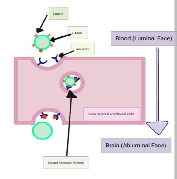 The protein is first encapsulated into vesicles using thin film hydration to coat the L-MAG protein molecules creating uniform vesicles which are then functionalised with Transferrin ligands. Jones, AR. and Shusta, E.V., 2007 (12). These transferrin ligands will then bind to transferrin receptors (TfR1) on the luminal side of the endothelial cells of the capillaries making up the blood brain barrier (BBB). The receptor ligand complex is then internalized by the endothelial cells and then released on the abluminal side of the endothelial cells, thus releasing the therapeutic molecule into the brain. This overcomes the issue of transporting L-MAG across the blood brain barrier. Baghirov, H., 2025 (13).