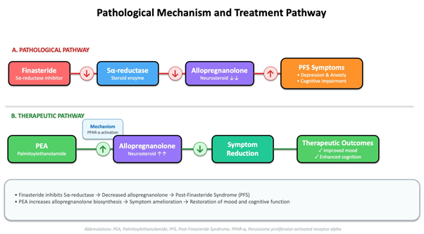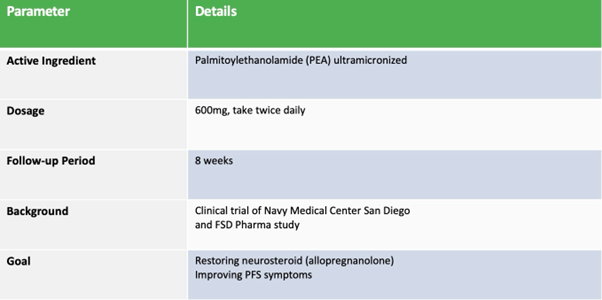Palmitoylethanolamide (PEA) is a natural fatty compound found in our body and foods such as eggs and peanuts. It has ability to enhance allopregnanolone synthesis process, reduce neuroinflammation and improve behaviour of anxiety and cognition. Pathological mechanism and treatment pathway of PFS and PEA is described in Figure 2.