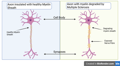 figure 1: Visualisation of the degradation of the myelin sheath caused by MS. Made with Biorender4