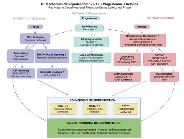 Figure 3: Pathways for Tri-mechanism Neuronal Protection During the Late Luteal Phase (Created in https://BioRender.com)