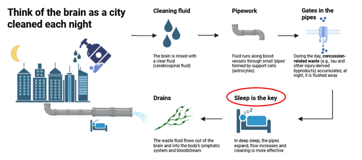 The brain has different systems trying to avoid deposits of mis-tagged tau protein. One of them is called the glymphatic system [6]. “The glymphatic system is the brain’s primary mechanism for clearing neurotoxic waste” [1]. It is closely linked to our sleep cycle and circadian dynamics – both rhythms that are disturbed after a concussion. If you think of the brain as a city that needs cleaning every night, the glymphatic system is the cleaning team and melatonin supplement can make it more efficient.